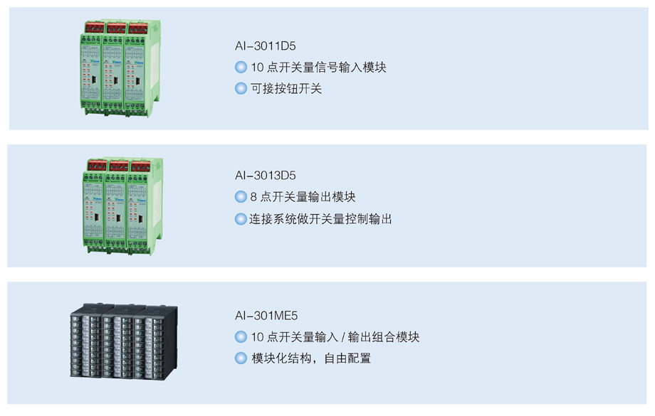 AI-301系列模塊通過RS485通訊接口為計算機監(jiān)控系統(tǒng)或觸模屏提供高可靠性的開關量及頻率信號采集輸入與繼電器開關輸出信號。它包含D5及E5兩種外型,其中E5型采用了平臺化概念,系統(tǒng)硬件與軟件分離,并可按需求任意安裝開關量輸入或繼電器輸出模塊;D5型不能安裝模塊, 有10點開關量輸入及8路繼電器輸出兩種規(guī)格,其安裝寬度僅為E5型的一半,更節(jié)省安裝空間。